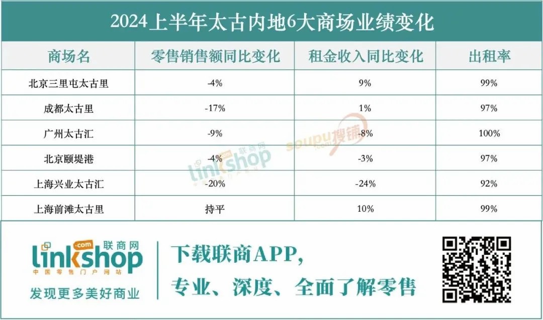 針對中國內(nèi)地市場,太古地產(chǎn)的零售物業(yè)在上半年表現(xiàn)出一定的分化趨勢。盡管整體零售銷售額實(shí)現(xiàn)了4%的同比增長,但具體到各個商場項目時,可以發(fā)現(xiàn)高端商場與綜合類商場之間存在明顯差異。高端商場普遍面臨銷售下滑的挑戰(zhàn),而綜合類商場則相對保持了穩(wěn)定。