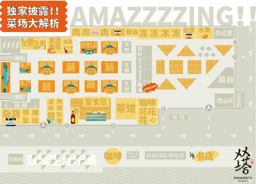 市集經(jīng)過精心設(shè)計與改造,增設(shè)出入口以增強(qiáng)開放性,并與濱河區(qū)域形成聯(lián)動,引入多樣化業(yè)態(tài)。蔬菜區(qū)作為核心,被雜貨、糧油及冷凍食品區(qū)環(huán)繞,全面滿足居民購物需求。南側(cè)新增的花店與咖啡館則為市集平添文藝氣息,并配備舒適的堂食區(qū),不僅豐富了市集功能,更彰顯了其現(xiàn)代感與時尚魅力。
