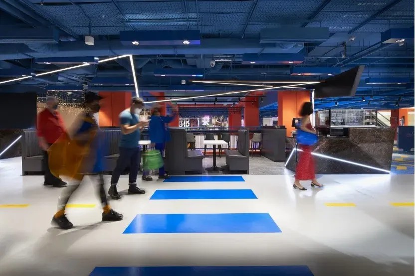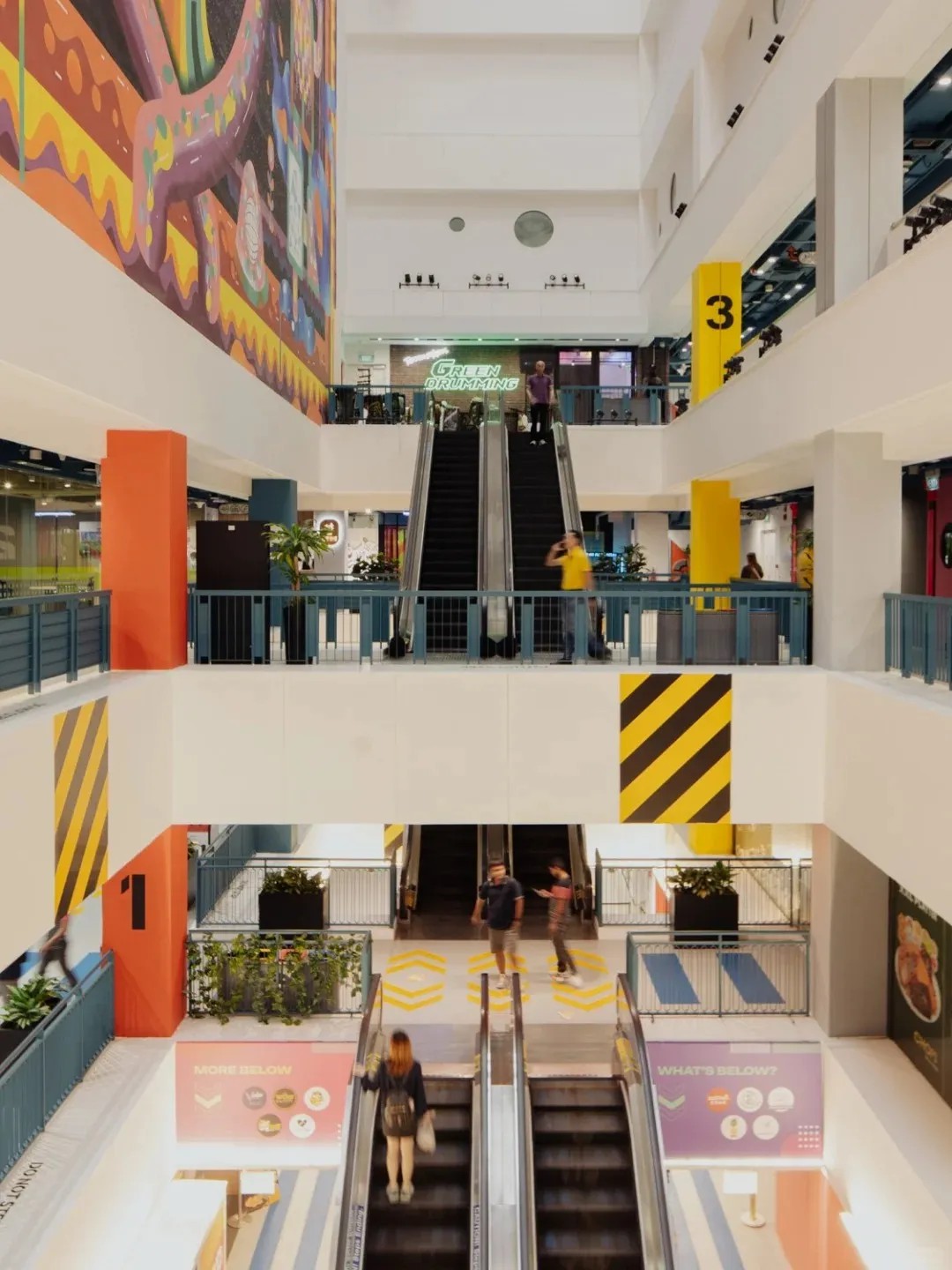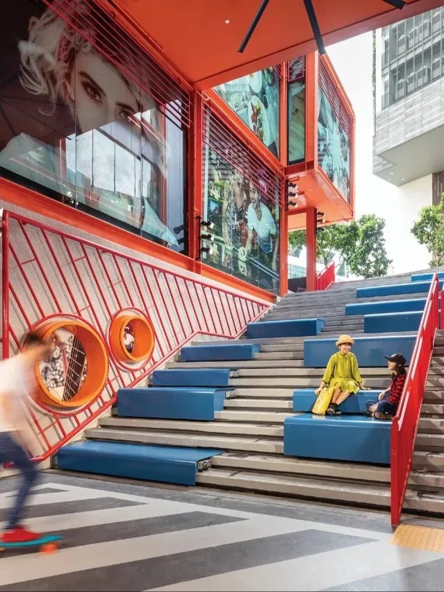 在空間優(yōu)化上,GRiD項目著重打造社交與活躍氛圍。通過引入“社交樓梯”理念,將傳統(tǒng)商鋪空間轉(zhuǎn)變?yōu)榧蓍e、交流與體驗于一體的多元功能區(qū)。這些設(shè)計不僅增強(qiáng)了建筑的視覺吸引力和可識別性,還以鮮明的橙色、藍(lán)色及白色調(diào),為空間注入活力與現(xiàn)代感,使其在城市街角中獨(dú)樹一幟。
