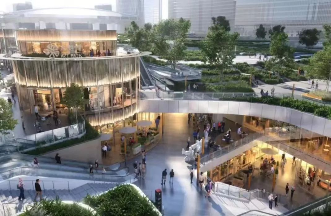 其次,打造公園+商業(yè)的模式,將休閑游憩功能與購物娛樂功能相結(jié)合,滿足消費(fèi)者更多情緒共鳴的需求,如中關(guān)村ART PARK設(shè)計(jì)了若干下沉廣場(chǎng),將地下空間向城市和公園界面開放,打造具有生態(tài)層次感三首層空間規(guī)劃;