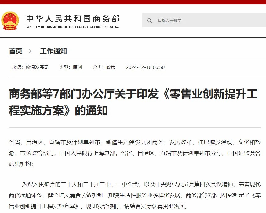 對(duì)實(shí)體商業(yè)而言,12月16日,商務(wù)部等七部門辦公廳聯(lián)合印發(fā)《零售業(yè)創(chuàng)新提升工程實(shí)施方案》(以下簡(jiǎn)稱《方案》),旨在推動(dòng)商業(yè)場(chǎng)景化改造、多元化業(yè)態(tài)融合創(chuàng)新、品質(zhì)化產(chǎn)品和服務(wù)供給、數(shù)字化賦能、產(chǎn)業(yè)鏈協(xié)同降本增效。